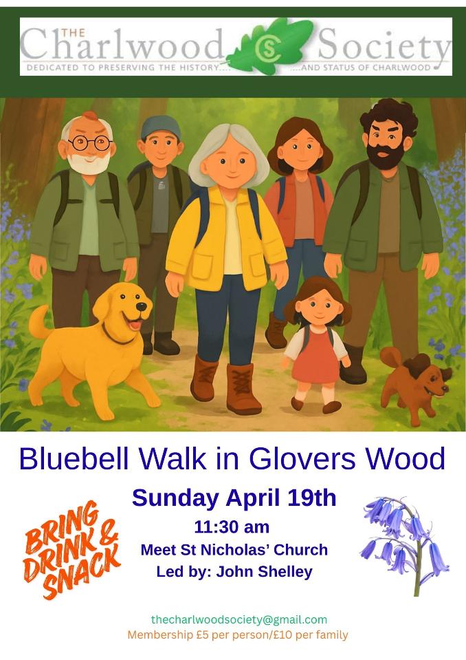 Bluebell Walk: Enjoy a beautiful walk amidst the bluebells in Glovers Wood on Saturday, April 20th at 10am. Meet at the Charlwood end of Glovers Road (RH6 0EG). Feel free to bring refreshments for yourself.